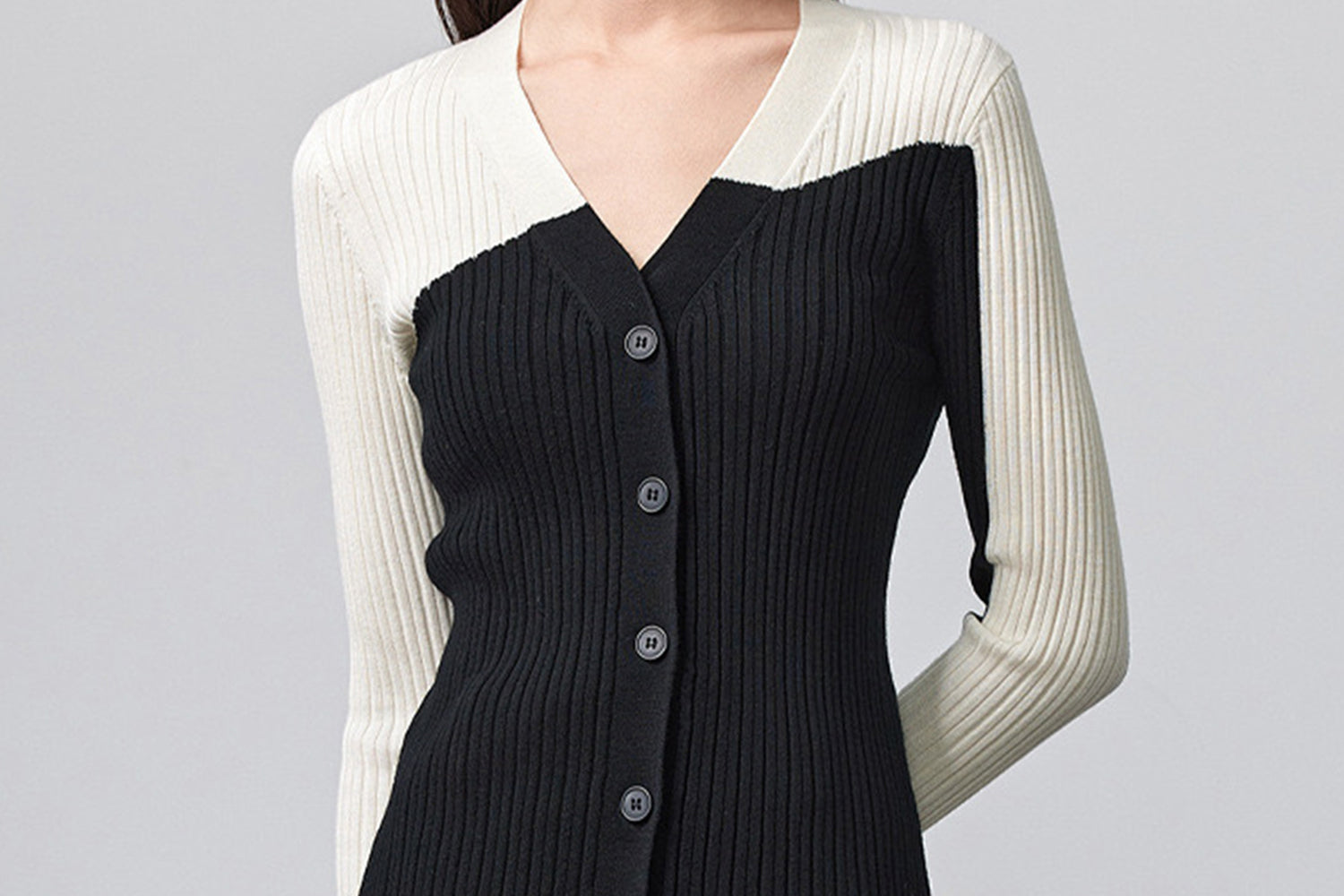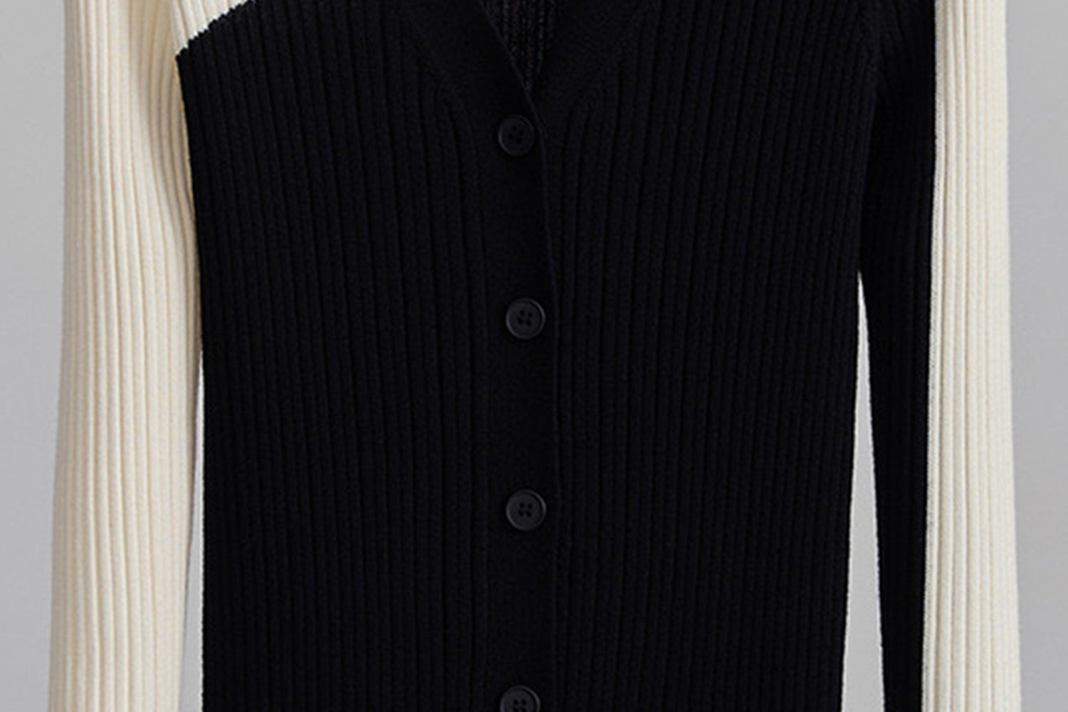 Elevate your wardrobe with this modern two-tone Blaise cardigan. Designed with a slim fit and ribbed texture, it features a button-down front for versatile styling. The bold contrasting color blocks add a chic touch, perfect for creating a standout look.