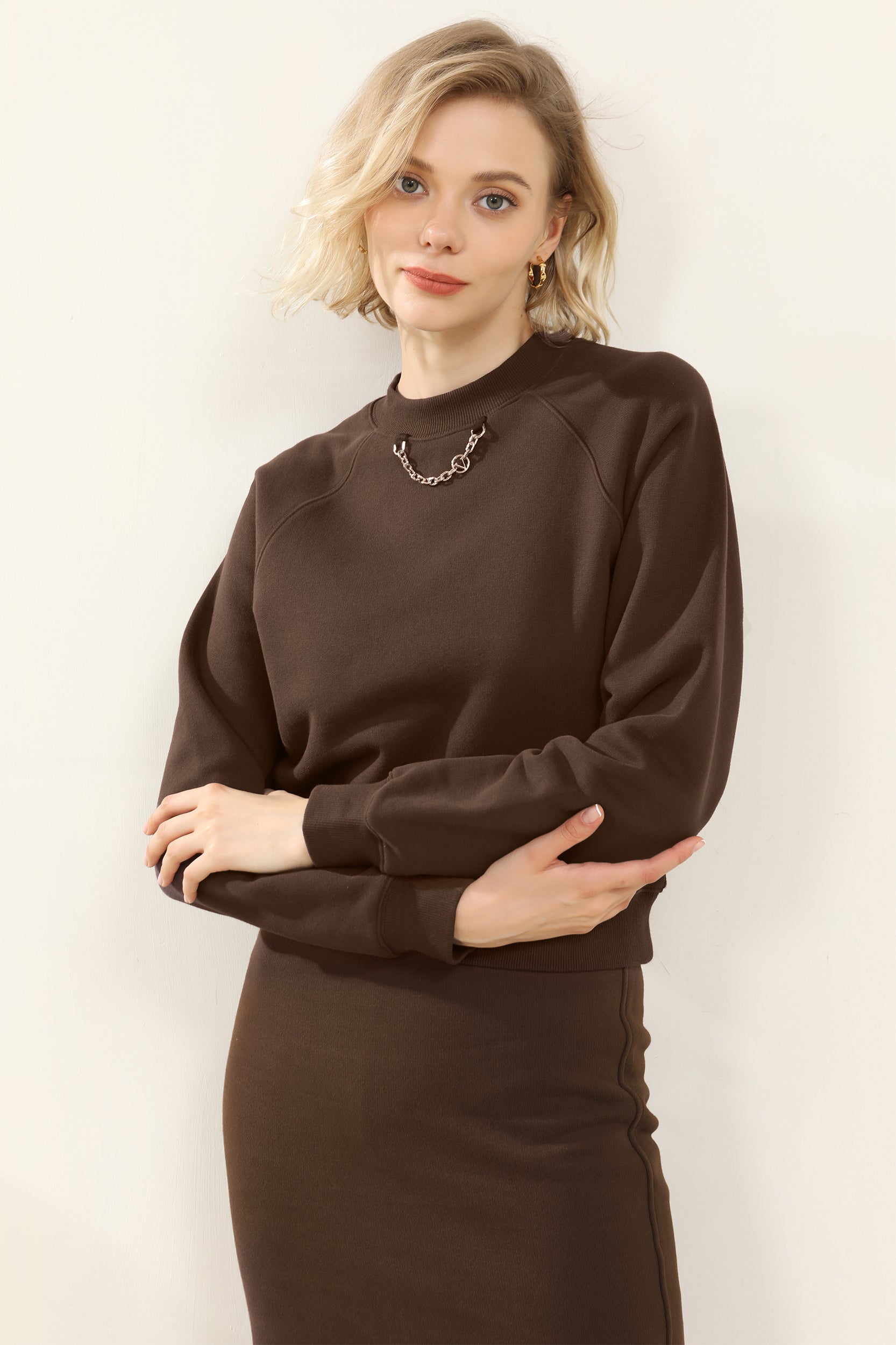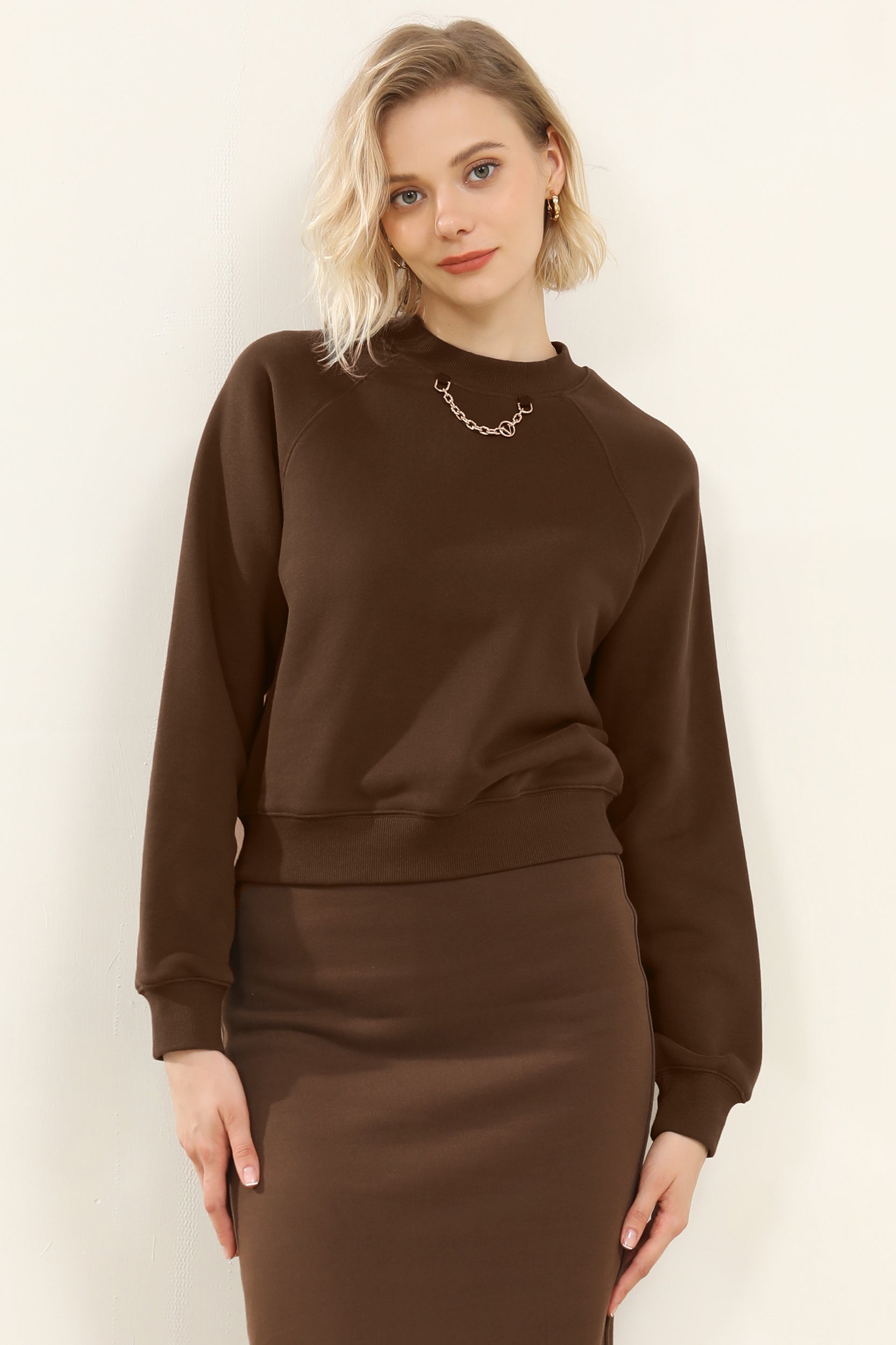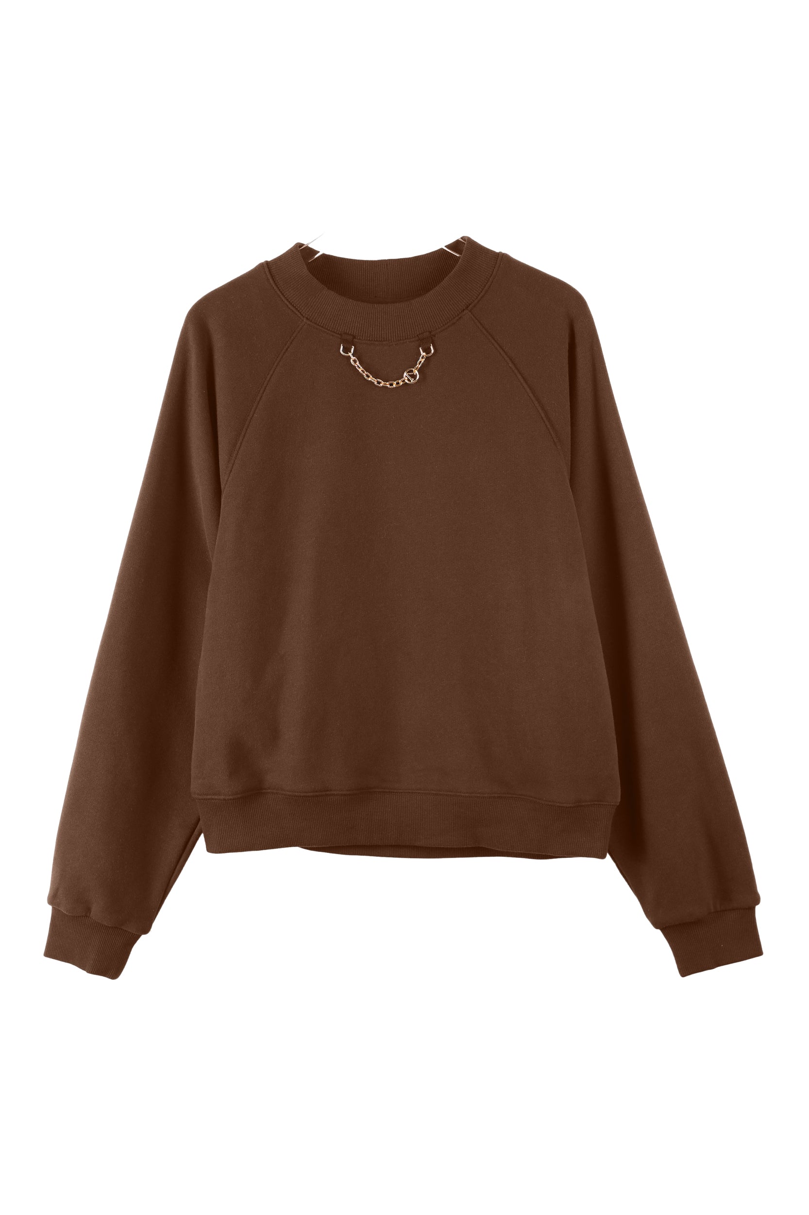 Elevate your casual style with this relaxed-fit Lesia sweatshirt, featuring a unique chain detail at the neckline for an edgy twist. The crew neck and raglan sleeves offer a comfortable and laid-back silhouette, while the soft fabric ensures all-day comfort. Perfect for layering or wearing on its own, this sweatshirt adds a hint of flair to your everyday wardrobe.