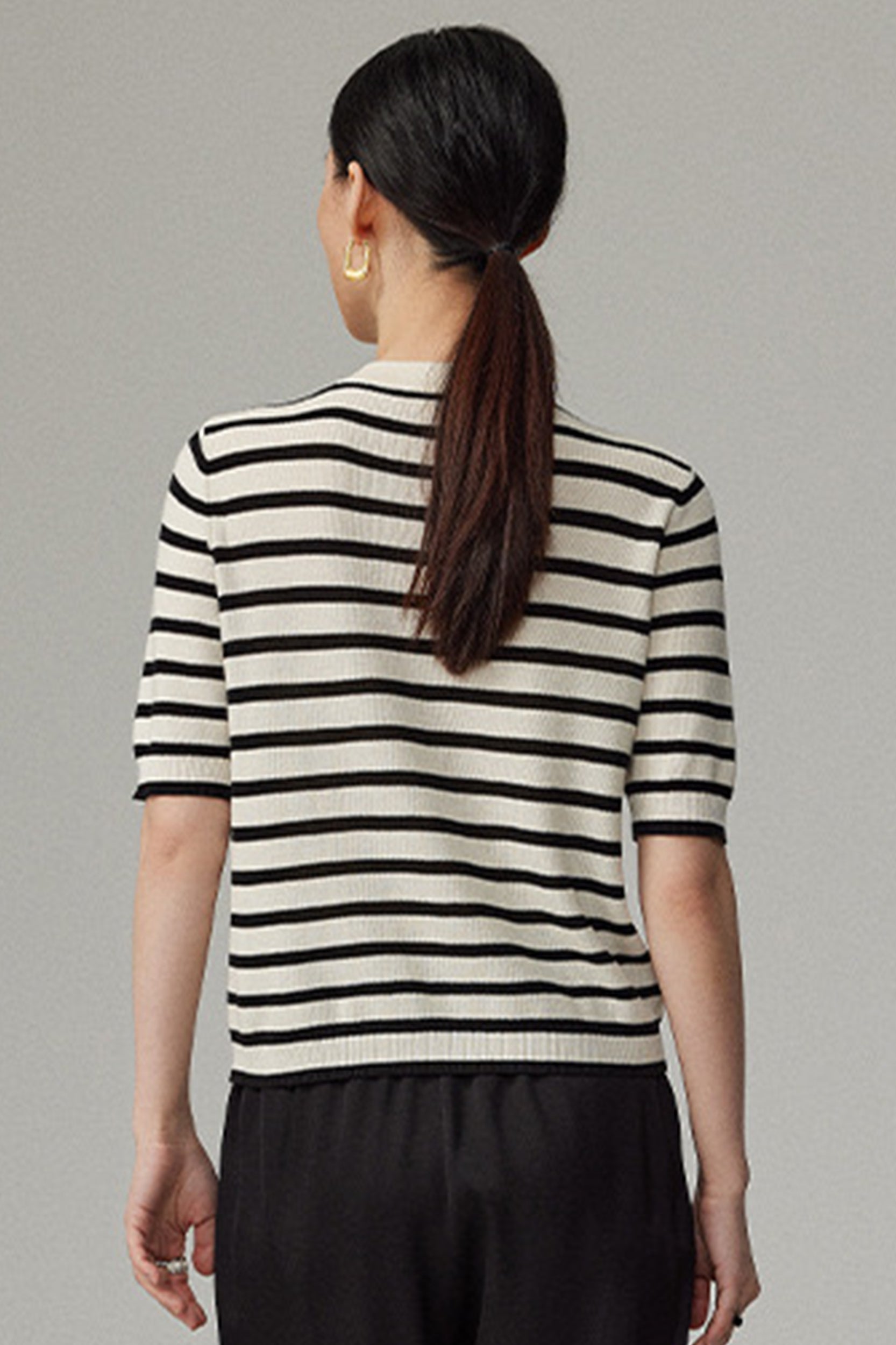 Experience refined elegance with the Xena cardigan. Crafted from a natural premium TENCEL silk blend, it offers a luxuriously soft, stretchy, and breathable feel, adorned with chic stripes, buttons, and a crew neck for sophisticated style.