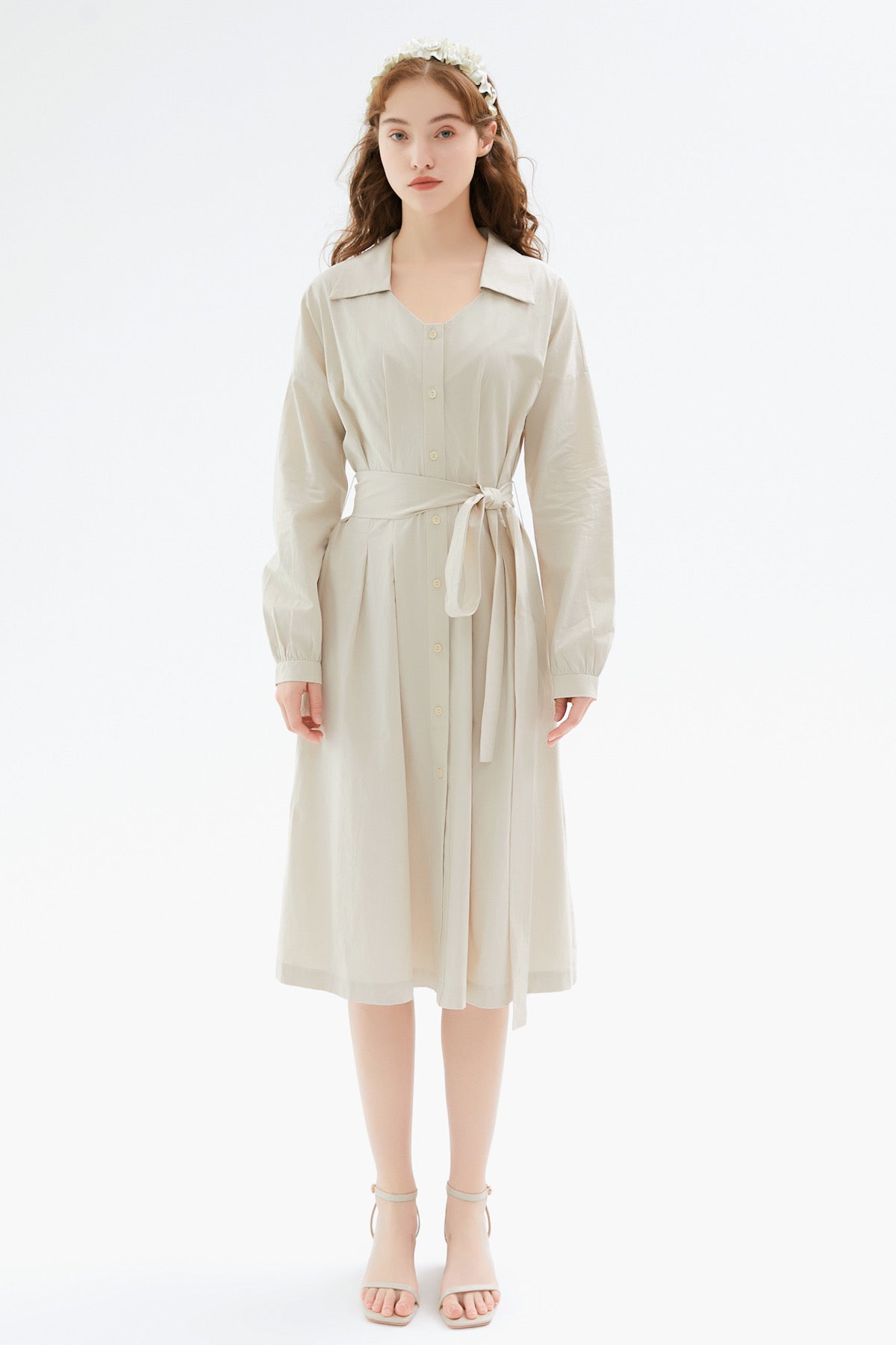An epitomy of timeless elegance, our beautiful Evalina dress features a modern collared neckline and sophisticated self tie belt.