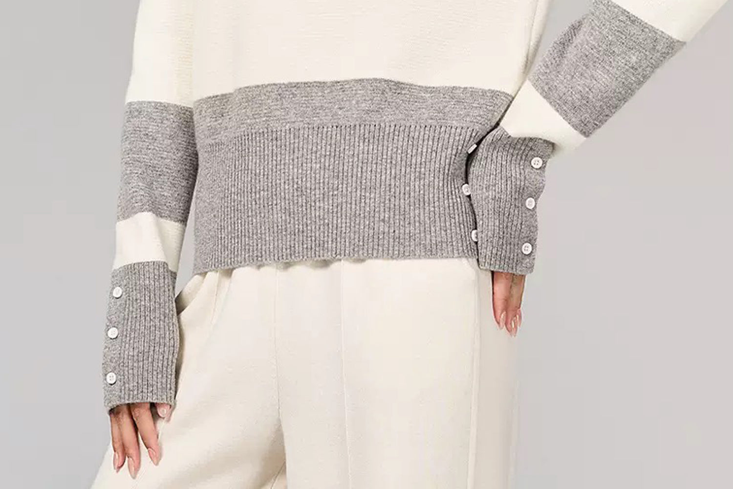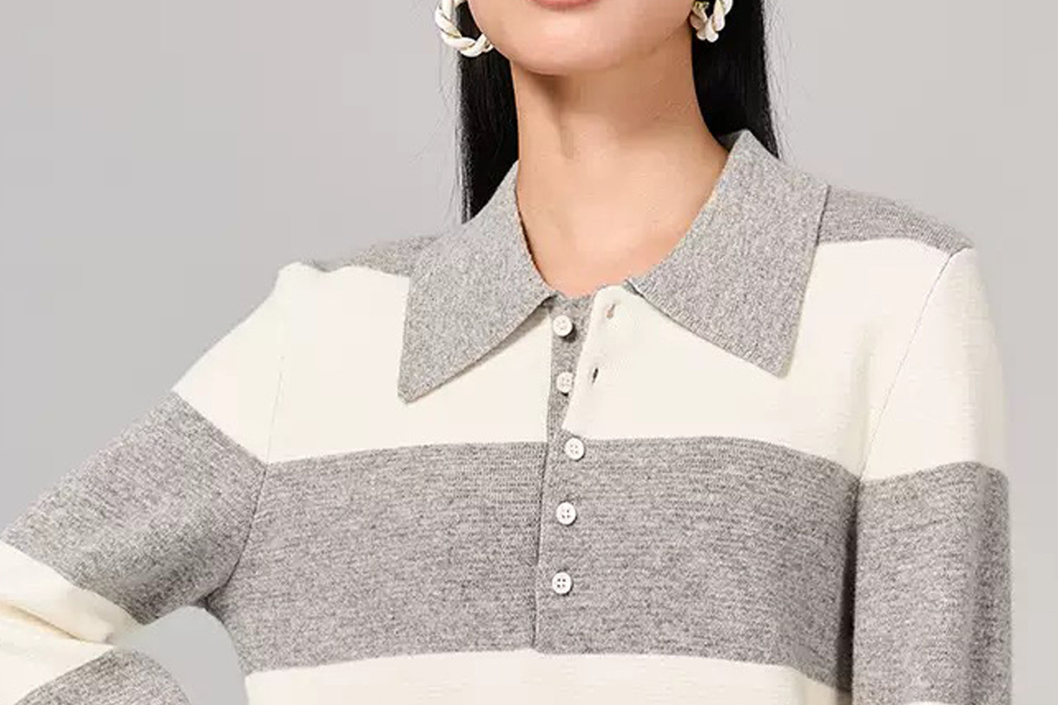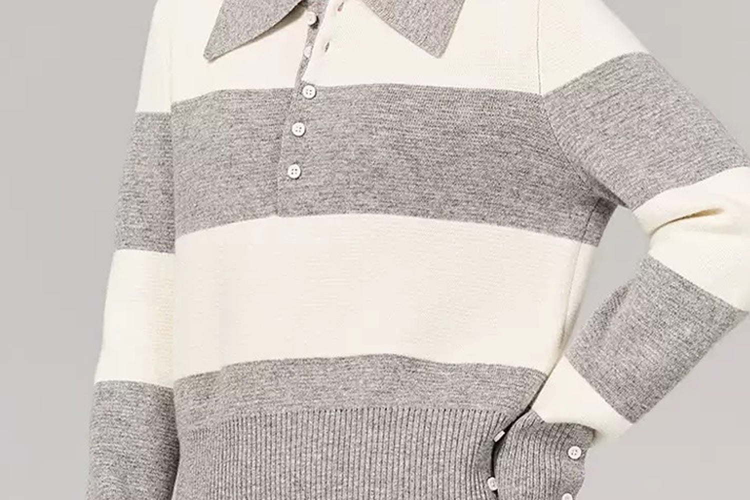 Wrap yourself in timeless style with our extra-fine merino wool sweater, accentuated by contrasting stripes and a classic polo collar. This premium sweater also features open ribbed hem and cuffs secured with chic buttons, creating a style that's both modern and sophisticated.