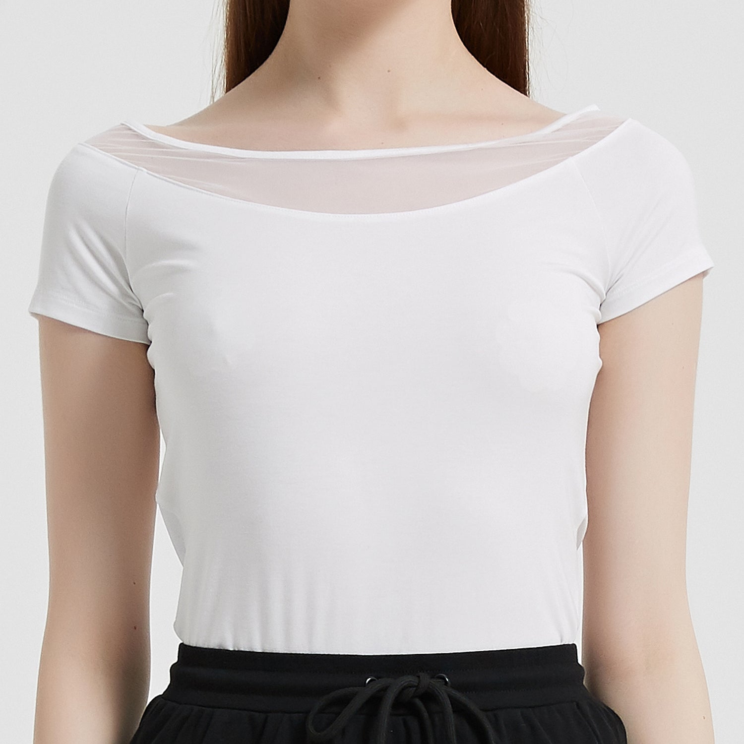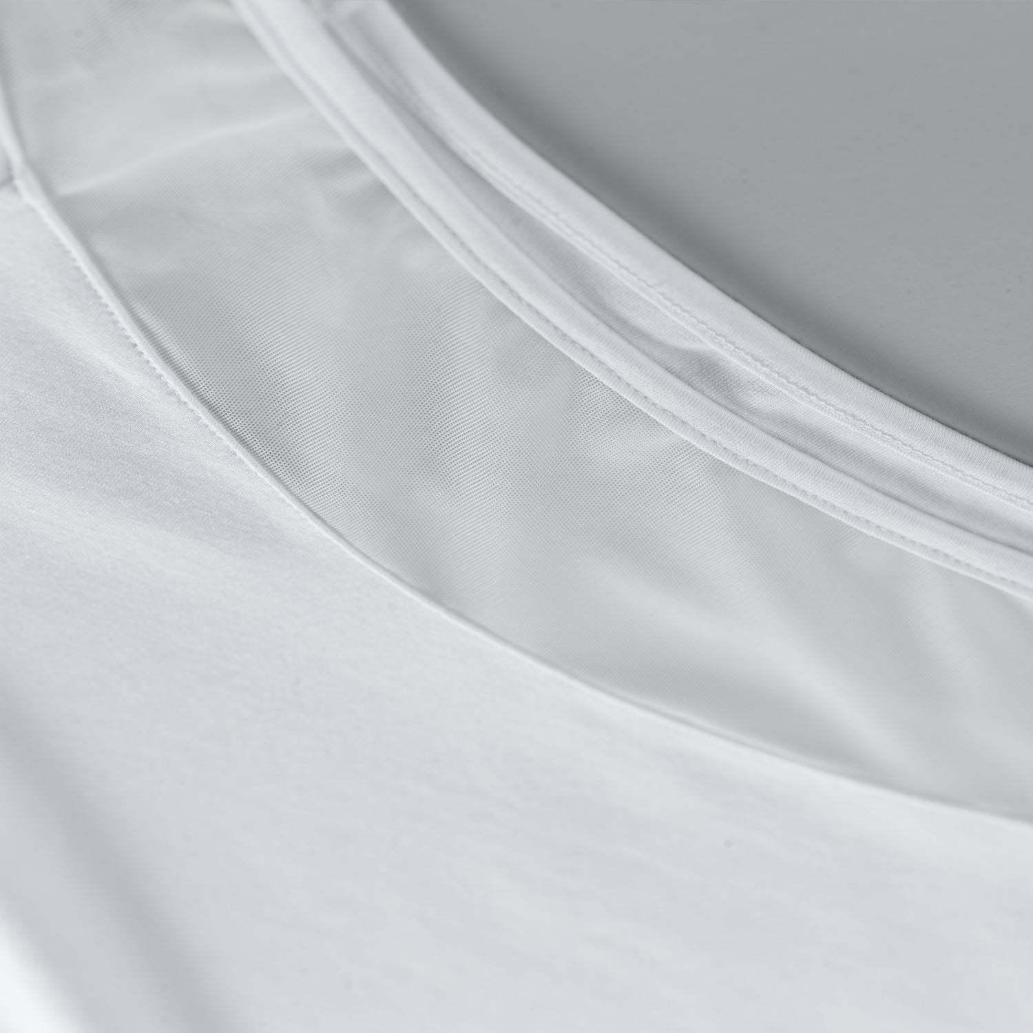 Elevate your casual style with our sleek form-fitting t-shirt, featuring an elegant mesh collar that adds a touch of sophistication and refinement.